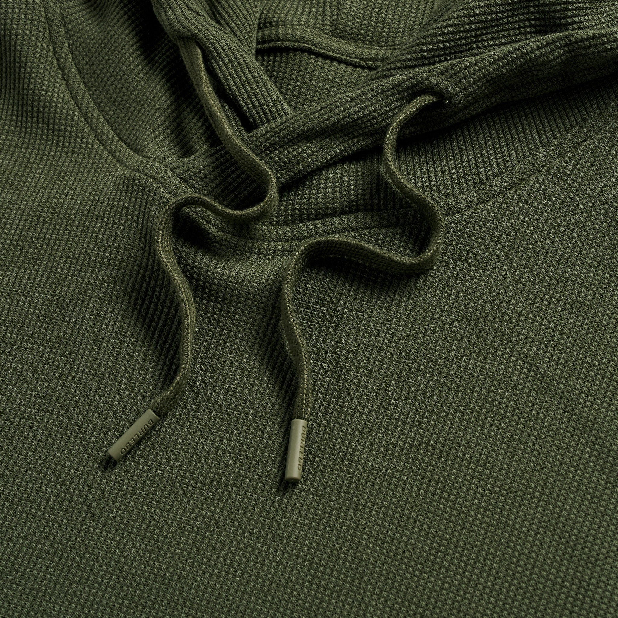 Thermal Hoodie from the Fall 25' Collection, made with a soft cotton blend and waffle knit texture for lightweight warmth and breathable comfort. Designed with a relaxed fit that’s perfect for wearing on its own or layering under a jacket. Finished with an easy pullover hood for casual, everyday wear.