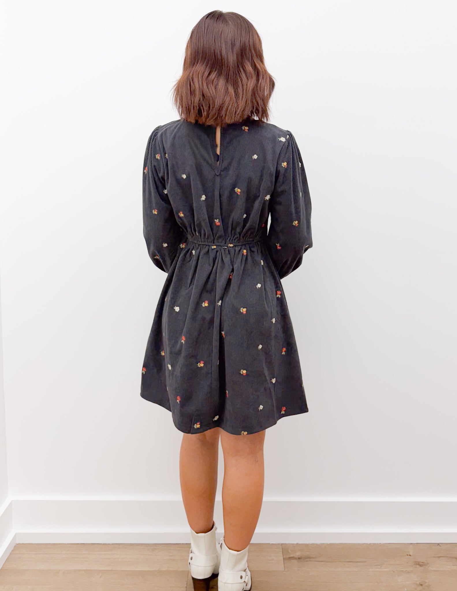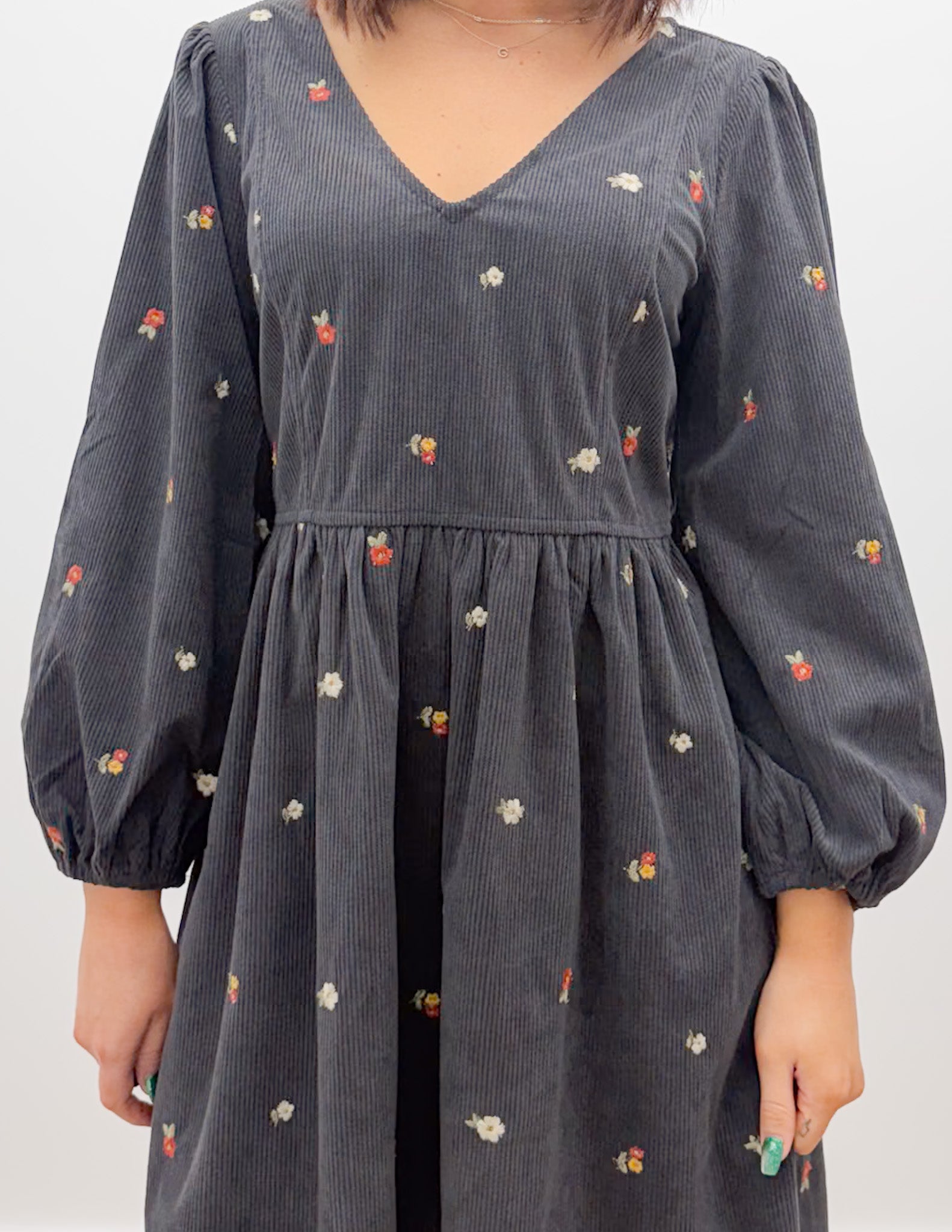 FLORAL EMBROIDERED CORDUROY V NECK MINI DRESS -100% POLYESTER