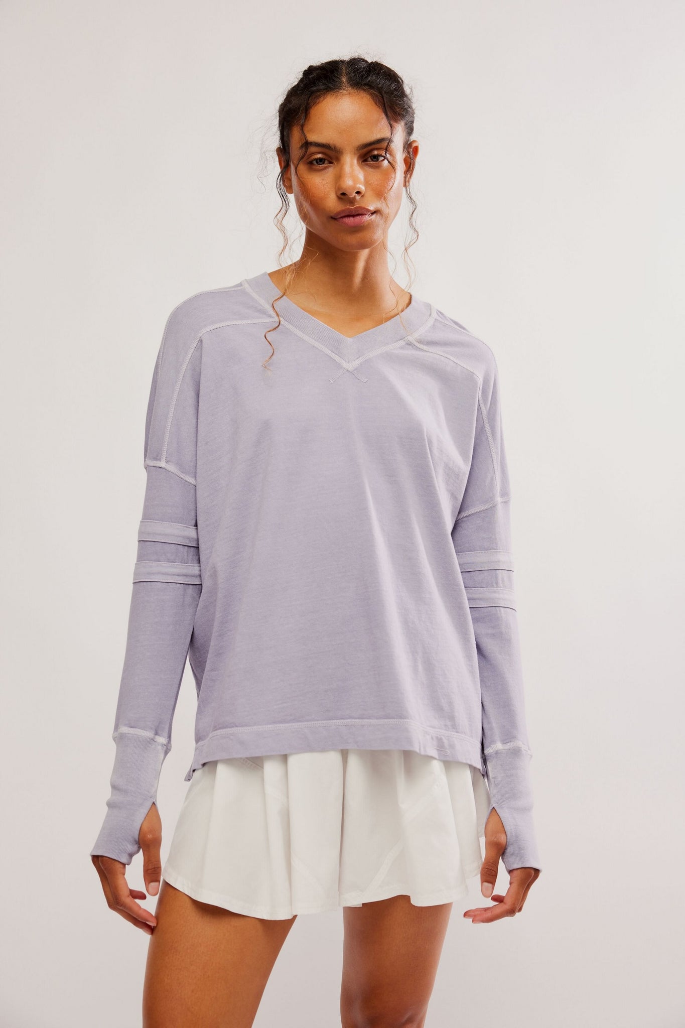 So classic long-sleeve tee featured in a soft cotton fabrication and oversized fit with a V-neckline and thumbholes at both wrists.