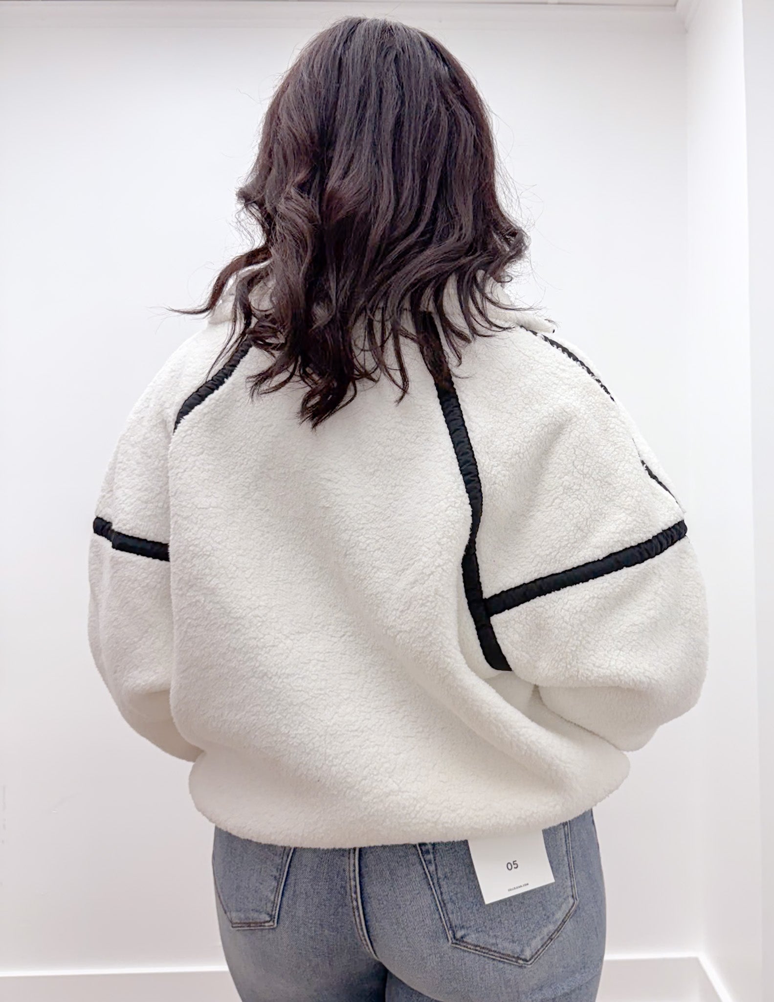 Cozy fleece pullover featuring a half-zip closure and high neckline with bold contrast seams throughout and an adjustable hemline.