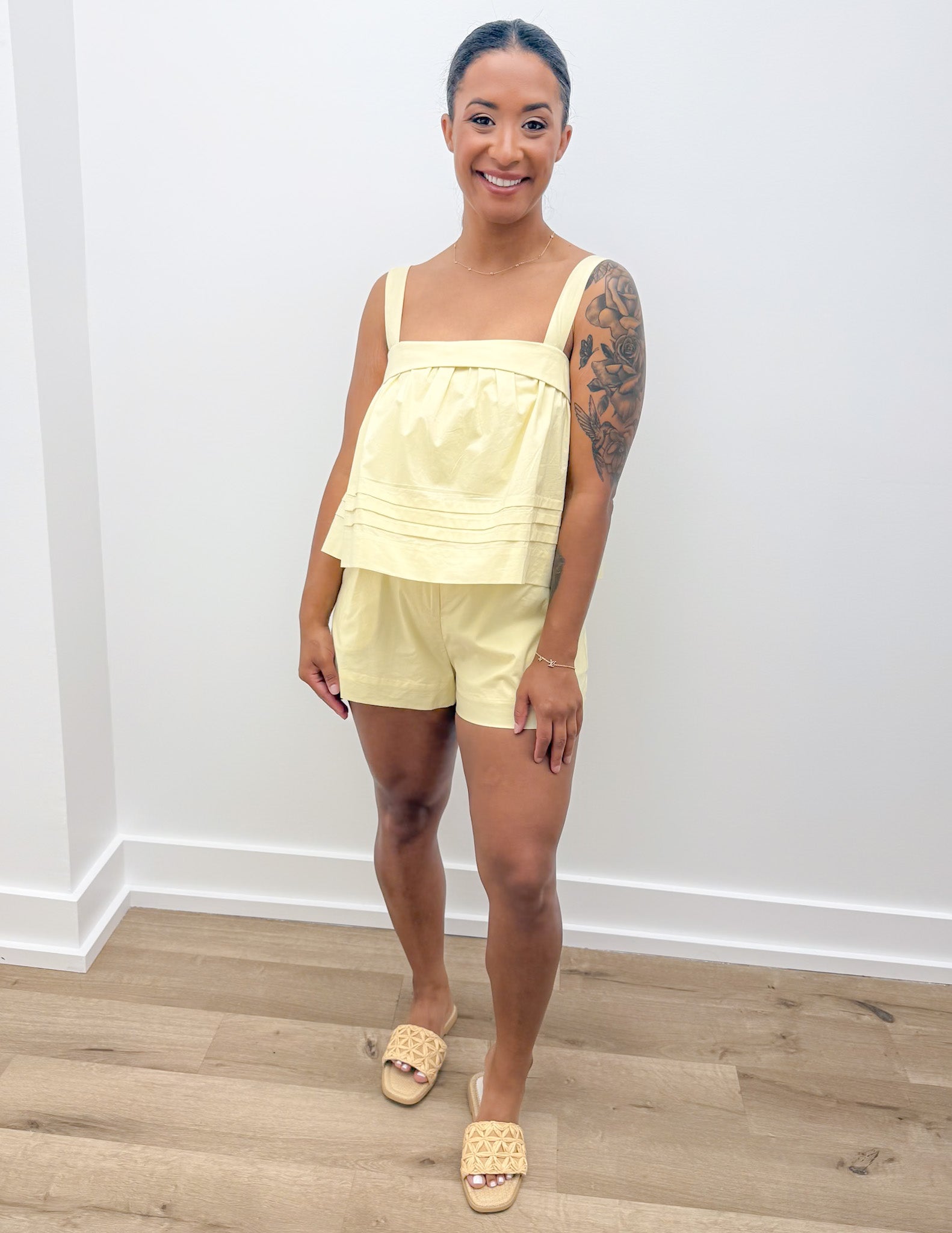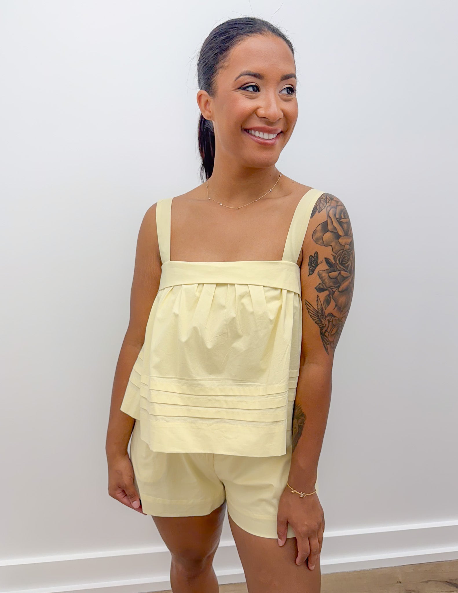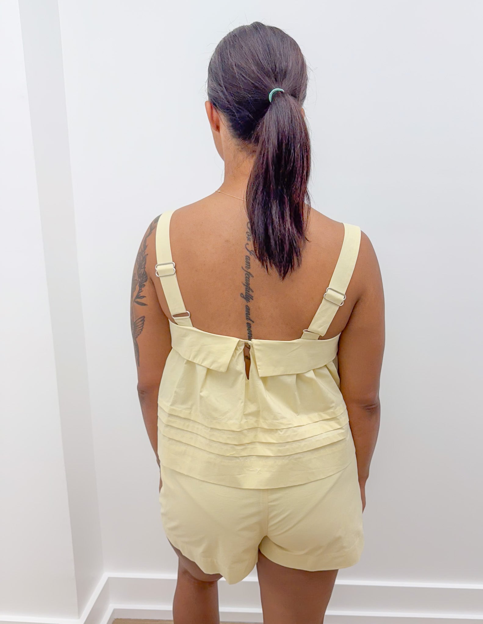 Solid sleeveless adjustable strap pintuck foldover
