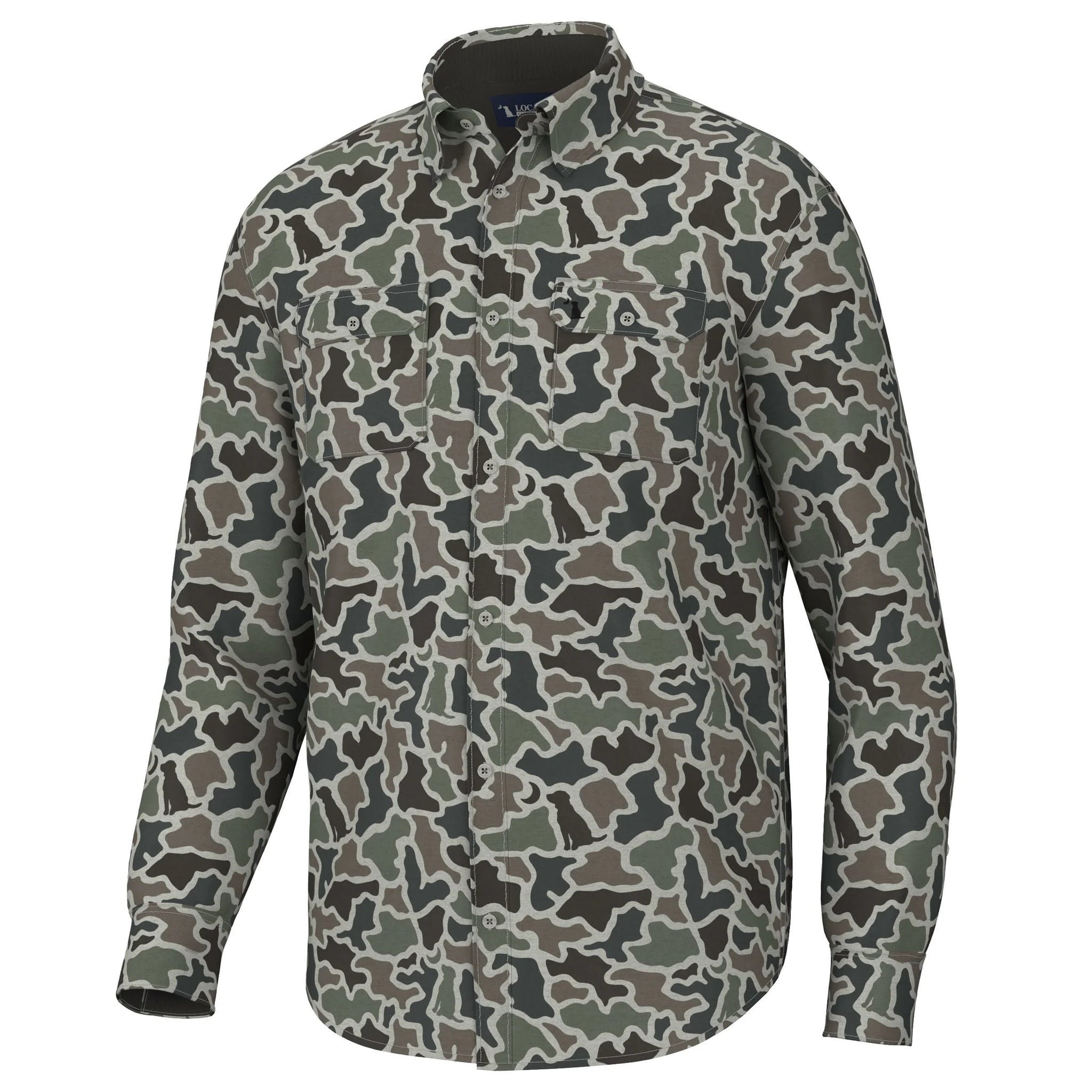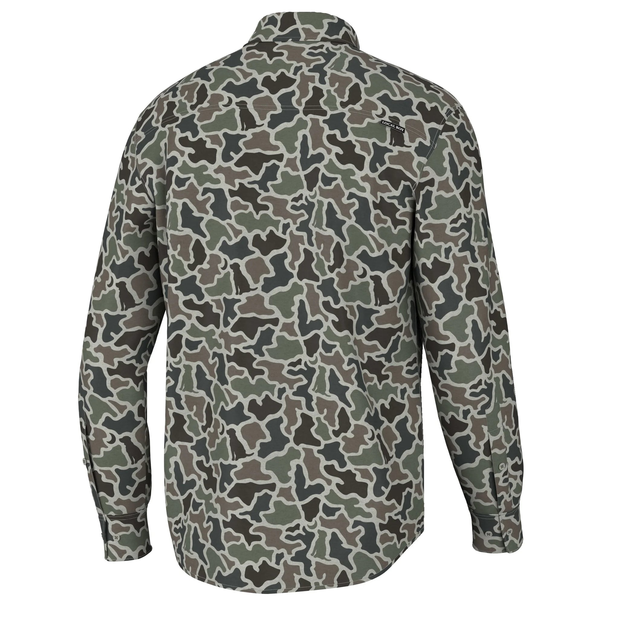 Embrace the rugged yet refined look of our camo button-ups. Crafted from a high-quality blend of 93% polyester and 7% spandex, this shirt offers a perfect balance of durability and flexibility. It is presented in some of our famous local boy camo prints with the thoughtful addition of corduroy detailing on the inside of the collar and cuffs. To finish it off, we added our signature dog and moon chest embroidery, double chest pockets, and a woven label on the back shoulder. This versatile shirt combines practicality with distinctive style, making it a wardrobe essential for any and all outdoorsman!