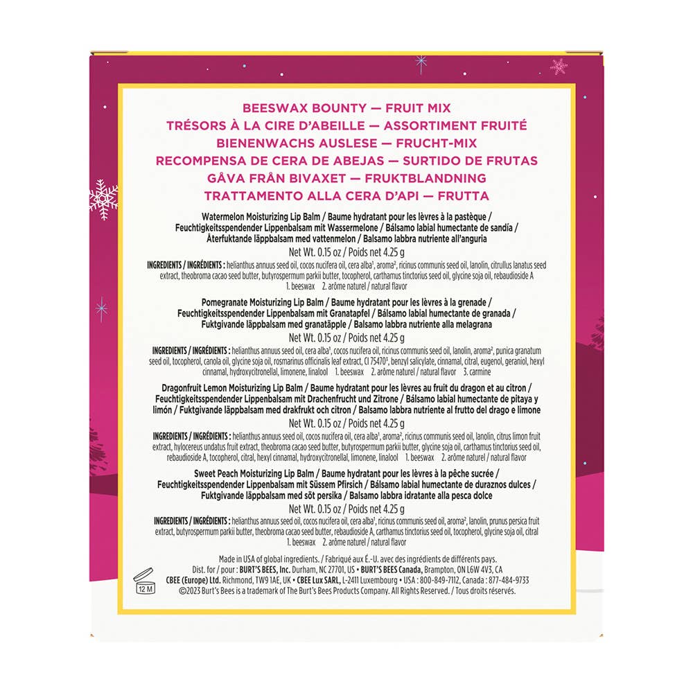 Give your loved ones the gift of lips that feel soft and taste great with this Burt's Bees Beeswax Bounty Lip Balm Gift Set. Formulated with beeswax and vitamin E, this natural lip balm richly moisturizes and softens dry lips. This lip balm comes in 4 beloved flavors, including Sweet Peach, Watermelon, Pomegranate and Dragonfruit Lemon. It glides on smoothly, leaving behind a tint-free, matte finish and smooth, supple lips. One Burt’s Bees Beeswax Bounty Lip Balm Gift Set featuring a fruity mix of moisturizing lip balm for men and women in festive holiday packaging. Nourishing vitamin E and beeswax richly moisturize and soften dry lips, making this lip balm set a fantastic holiday gift for skin care and lip care lovers.