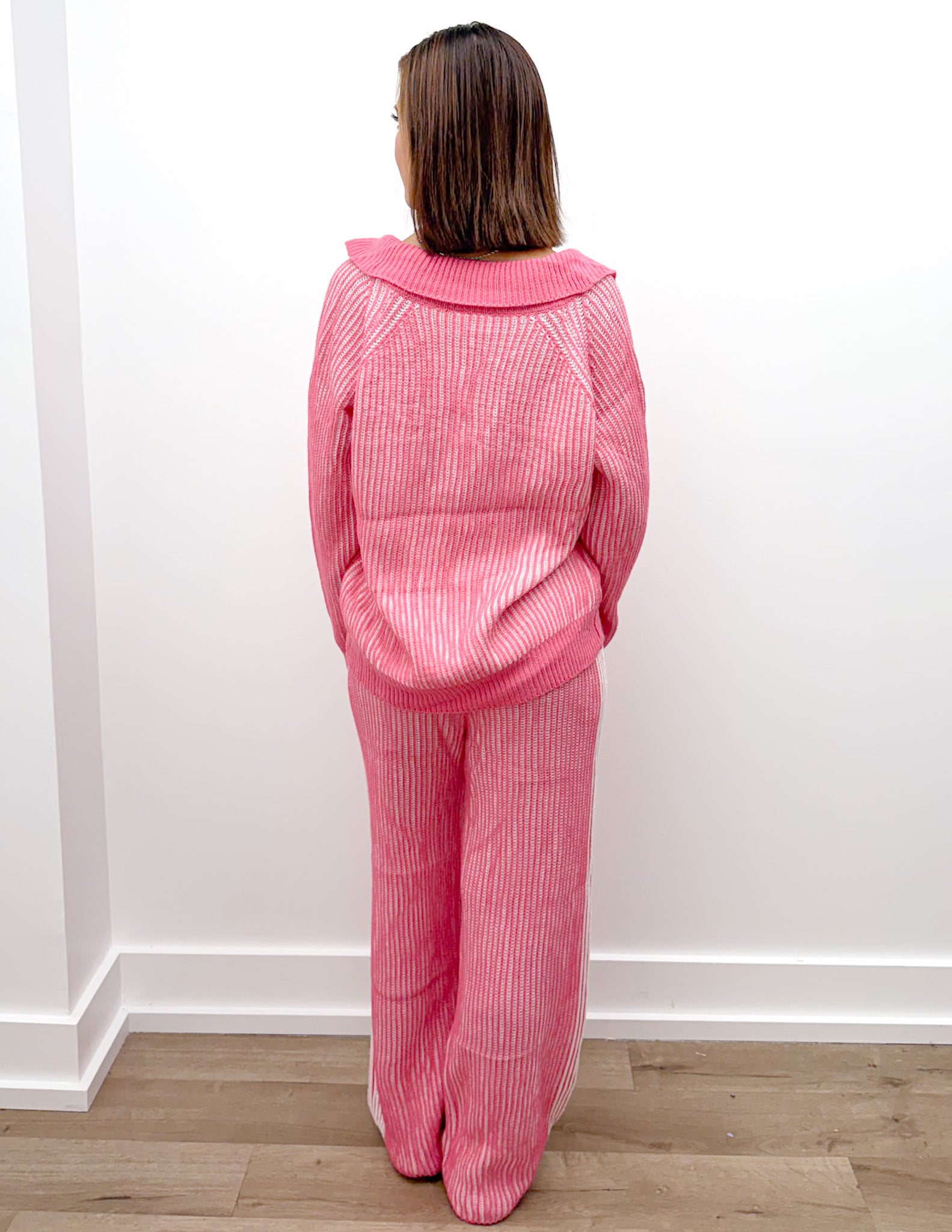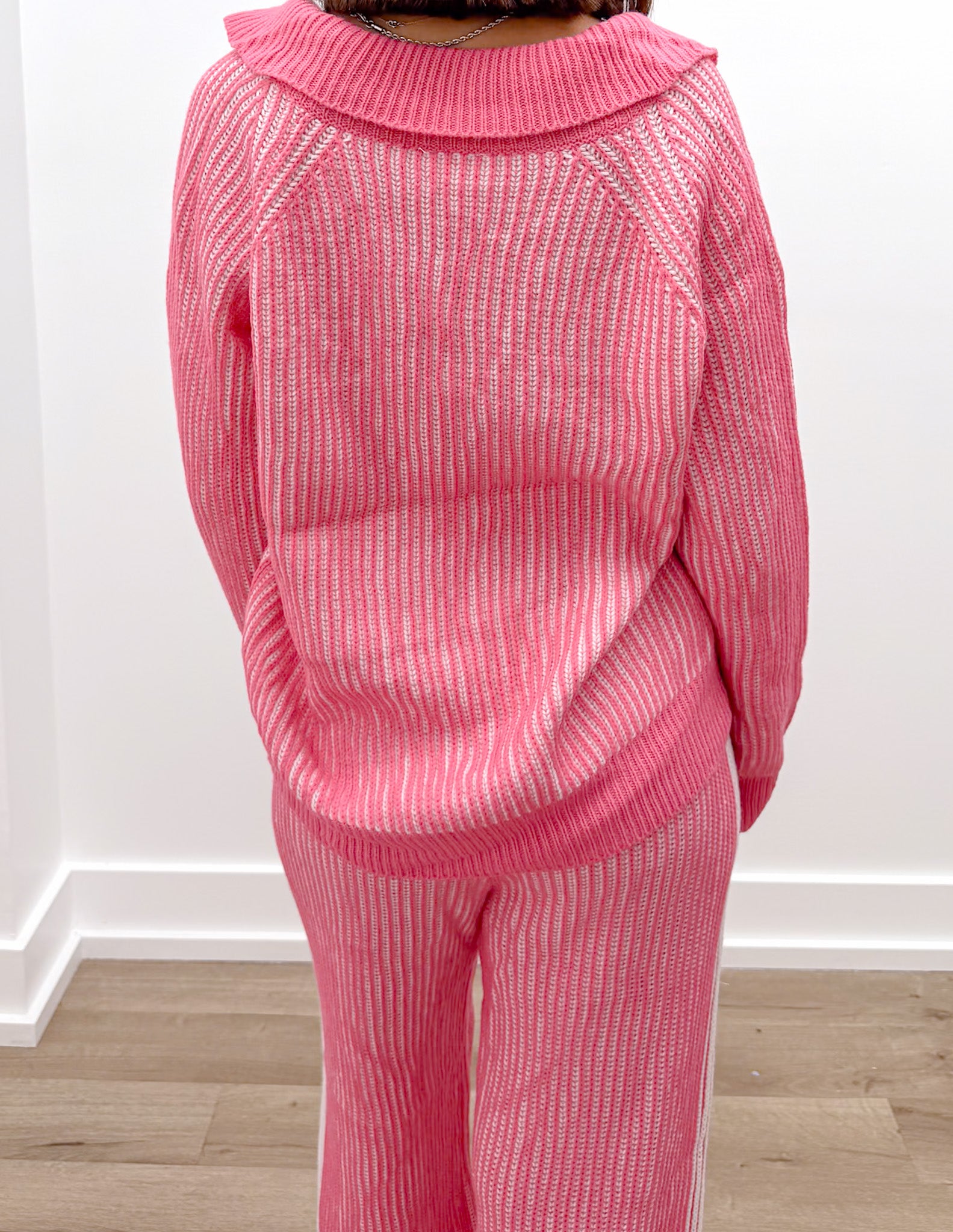 TWO TONE RIB TEXTURE COLLARED SWEATER AND PANTS SET