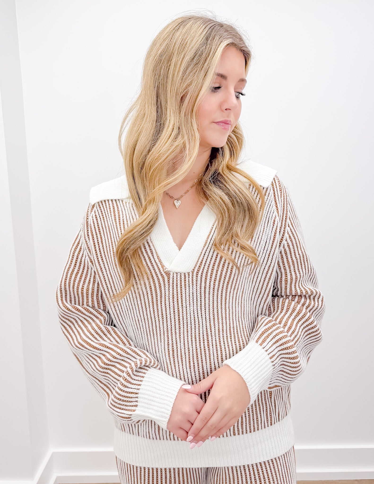TWO TONE RIB TEXTURE COLLARED SWEATER AND PANTS SET