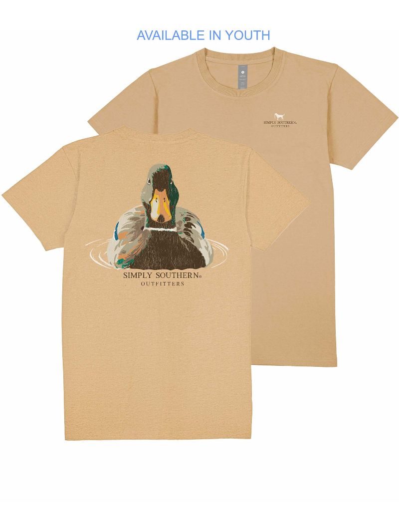 Khaki short sleeve shirt with a mallard in water and Simply Southern logo below.Simply Southern logo with dog holding leash in mouth on left chest. 100% cotton. Unisex sizing.