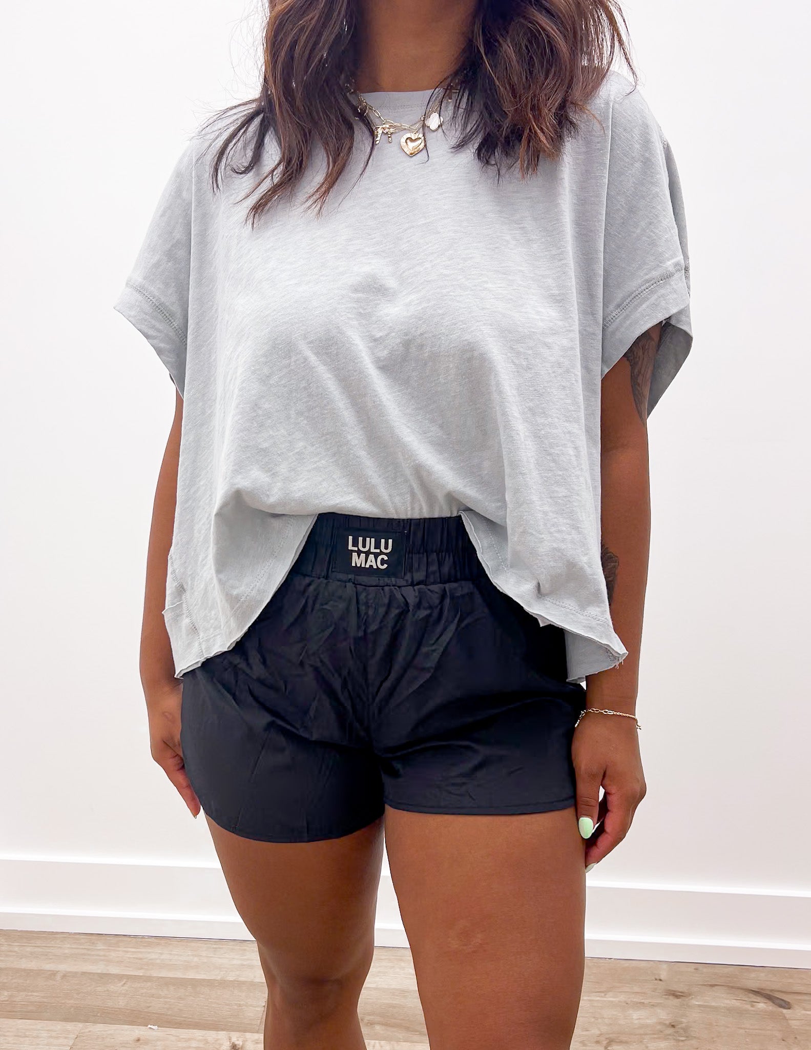 look for any occasion. Features: - Breathable and lightweight cotton slub fabric - Relaxed fit / Oversized - Cropped length - Wide round neckline - Short sleeve tee - Dropped armhole - Open back - Raw edge details