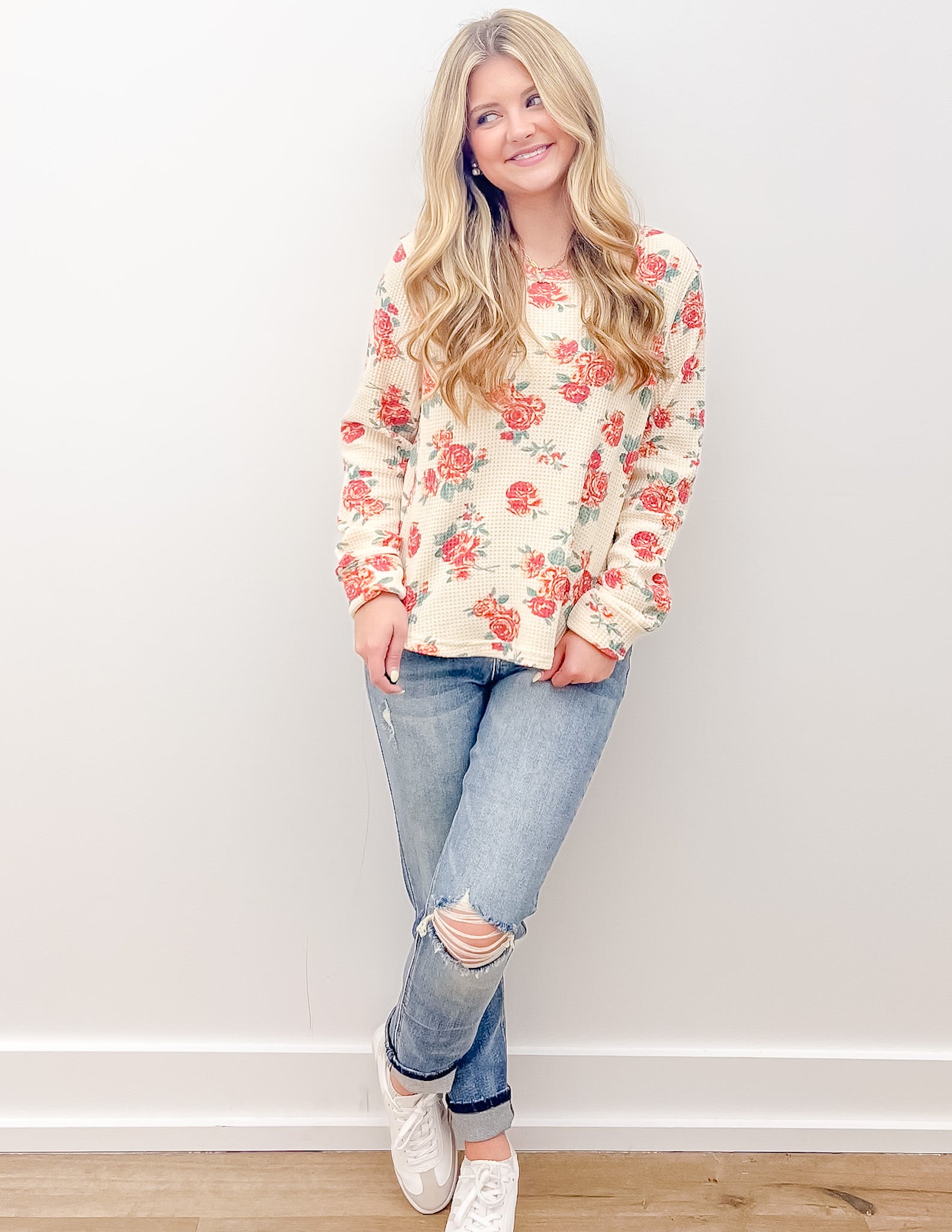 FLORAL PRINT WASHED WAFFLE THERMAL TOP WITH THUMB HOLES 65%POLYESTER 35%COTTON