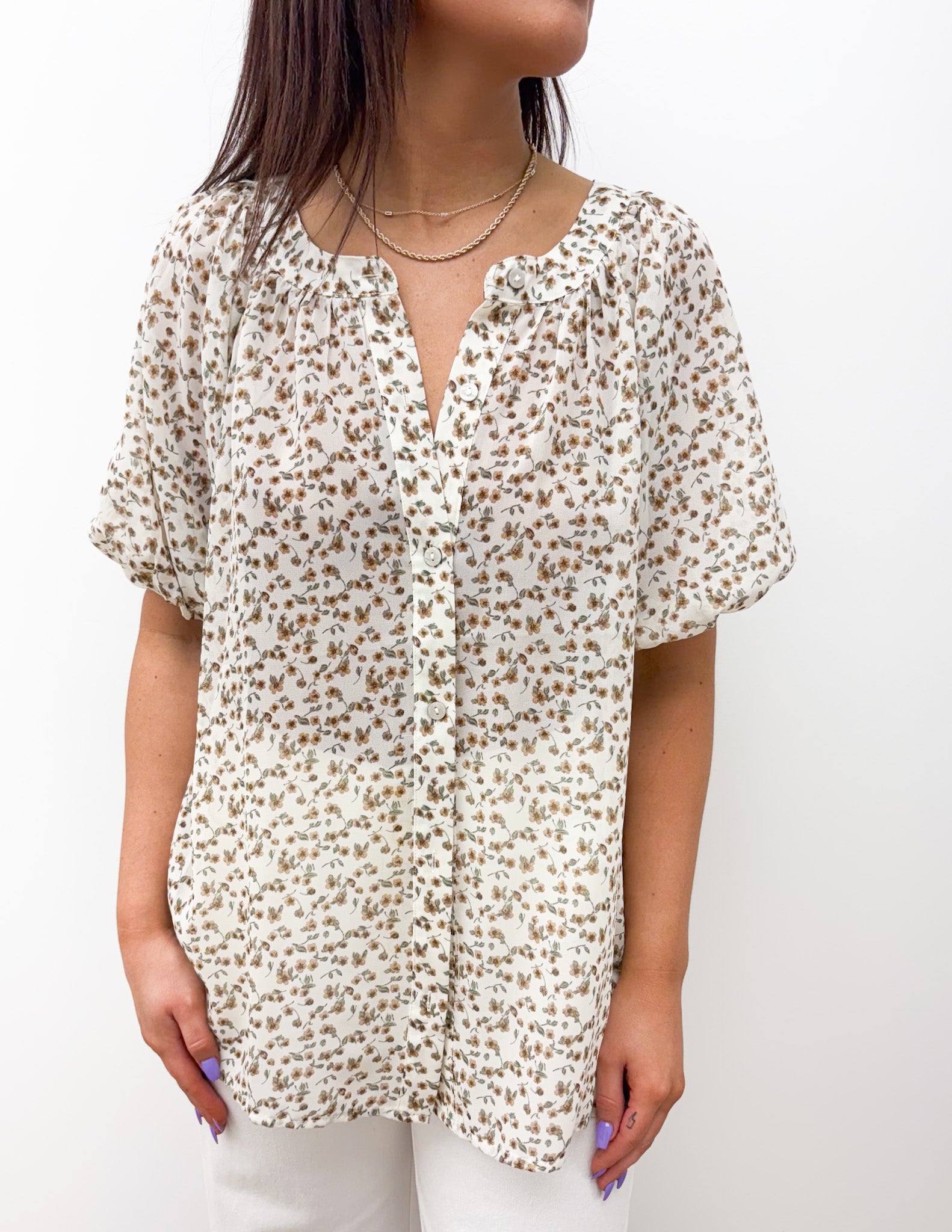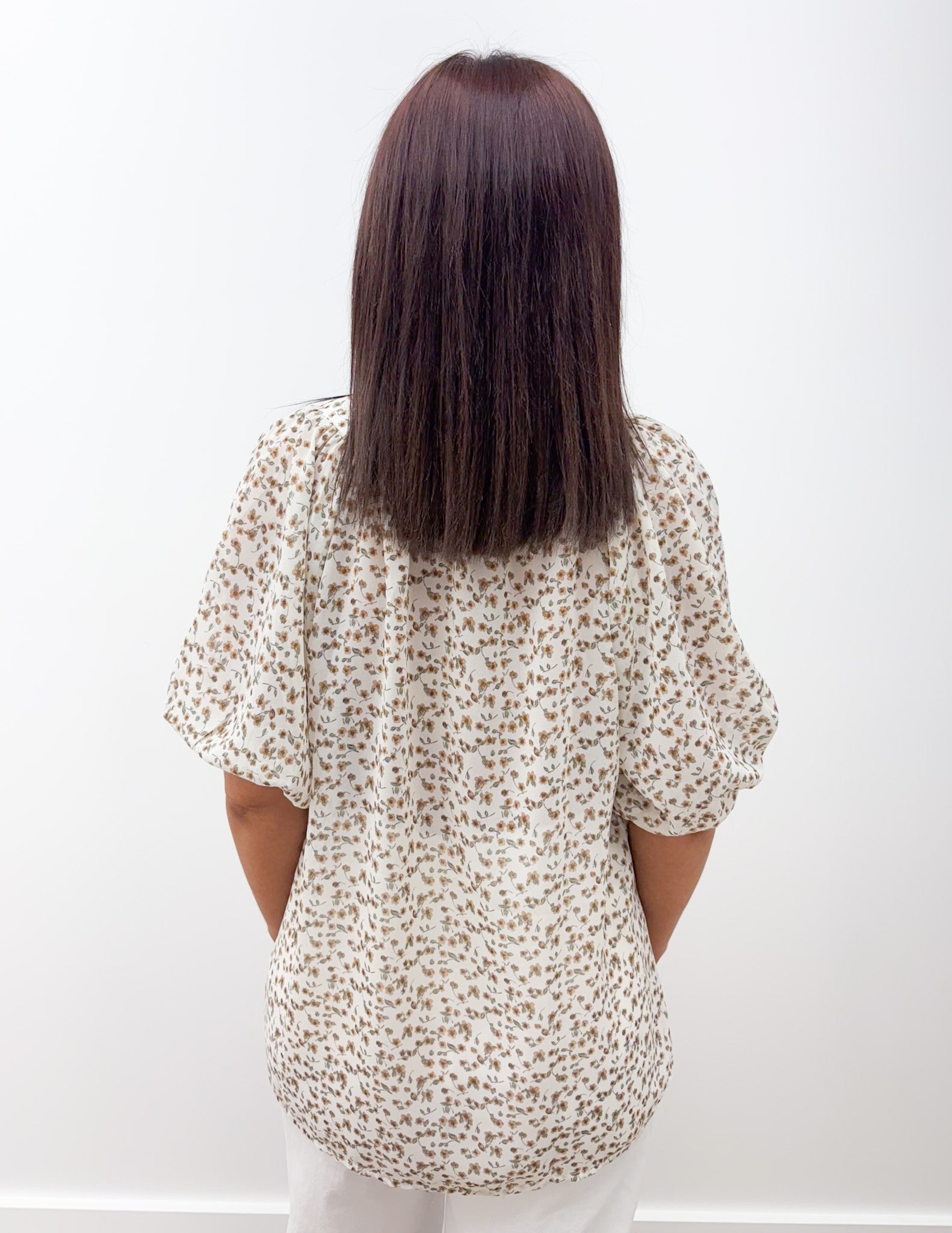 LOOSE FIT SHEER FLORAL PRINT HALF BALLOON SLEEVE TOP
