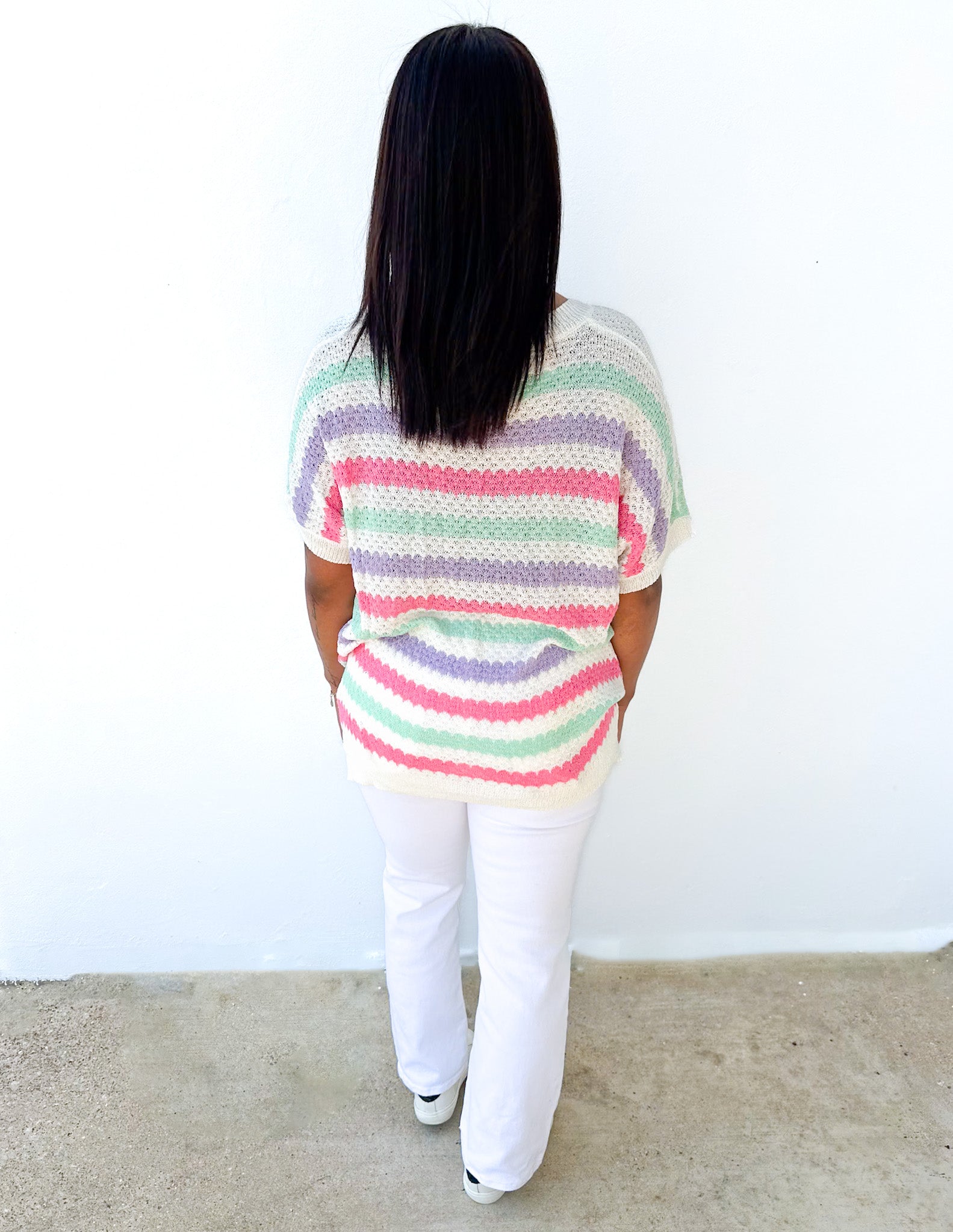LOW GAUGE MULTI COLORS STRIPE V-NECK SHORT SLEEVE KNIT TOPadult female