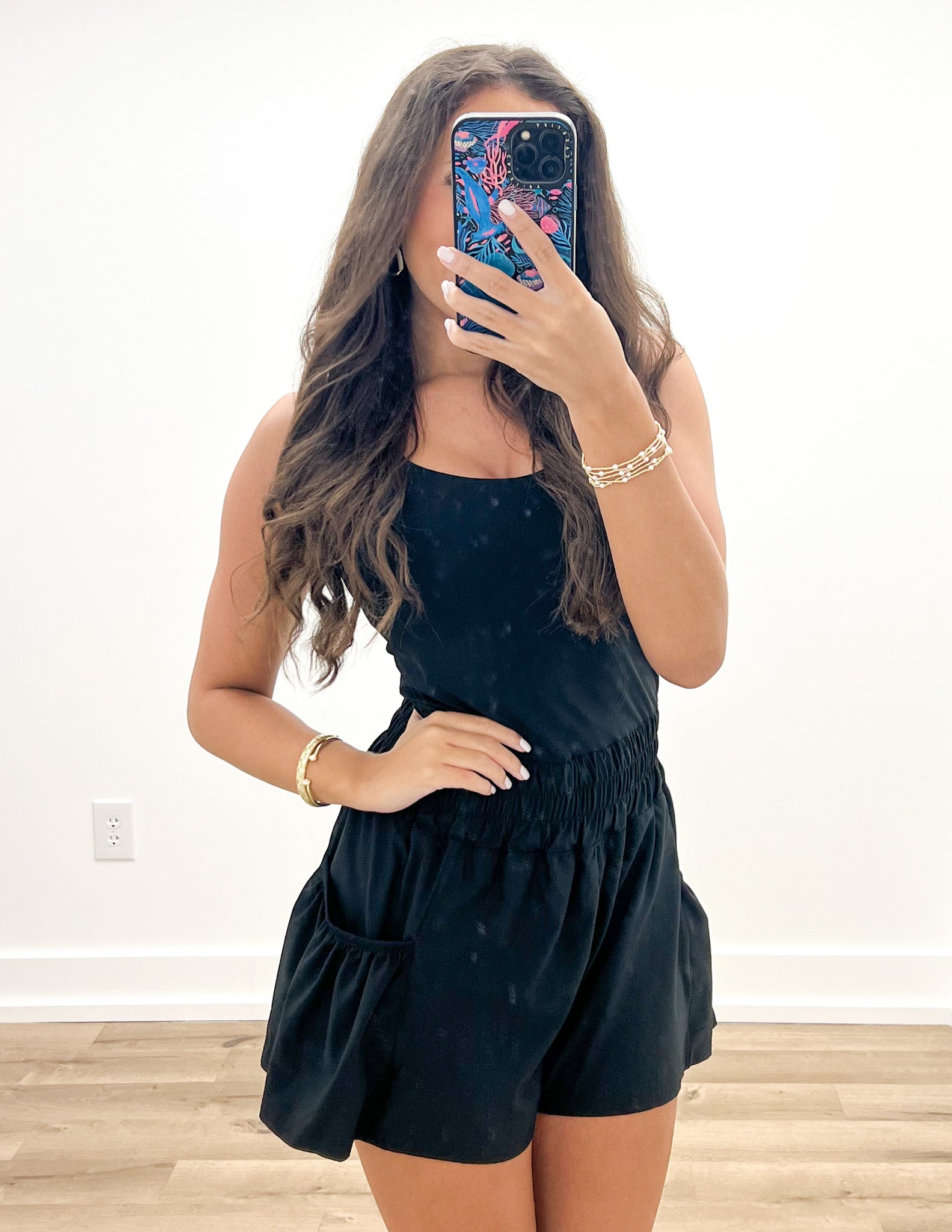 Turn up the charm with the Flounce & Flow Romper—a playful one-piece inspired by your favorite flounce shorts. The fitted upper body features a V-neckline for a touch of allure and a U-shaped back for a subtle peek of skin. The wide-leg shorts allow for easy movement, while bungee elastic side pockets add a flirty drape and functional flair. Designed with a wide, comfortable elastic waistband, this romper provides a flattering fit without feeling restrictive. Perfect for sunny adventures or casual outings, the Flounce & Flow Romper combines style and ease effortlessly.