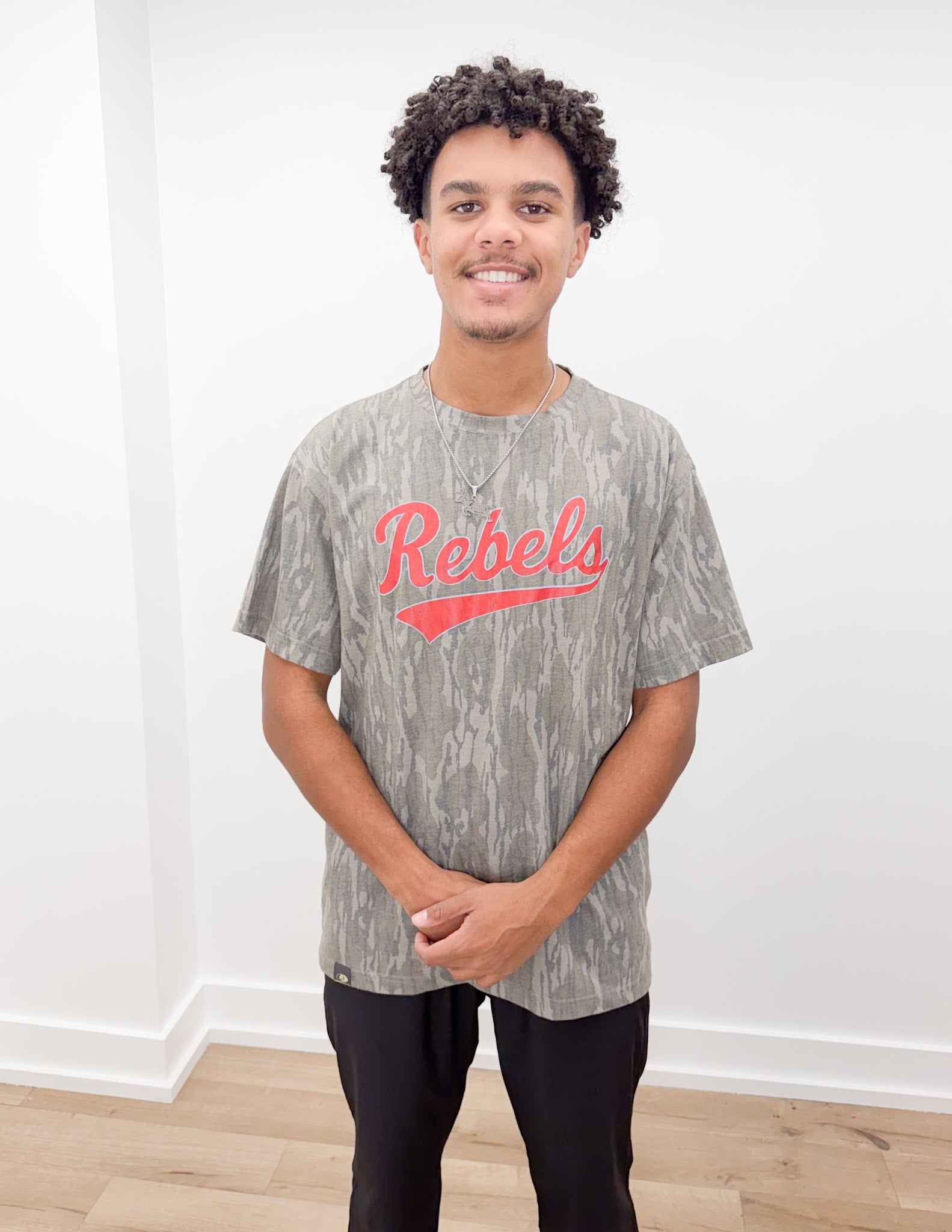 Red Rebels Script Logo on Bottomland SS Tee