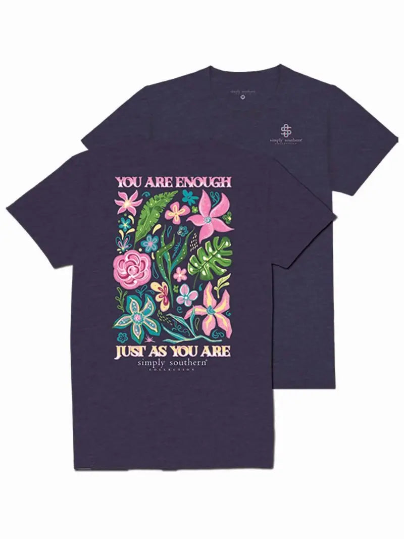 Heather navy short sleeve shirt with the phrase 'You are enough just as you are' and a collage of flowers and plants in a chalk art style. Simply Southern logo below and on left chest. 100% cotton. Unisex sizing.