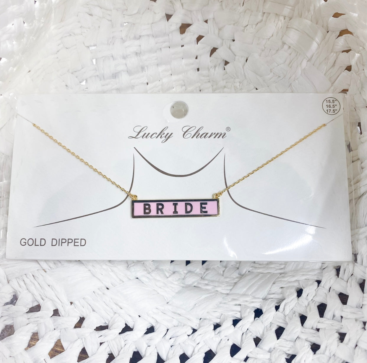 BRIDE text rectangular tag charm necklace. Approx: 15.5"-17.5"